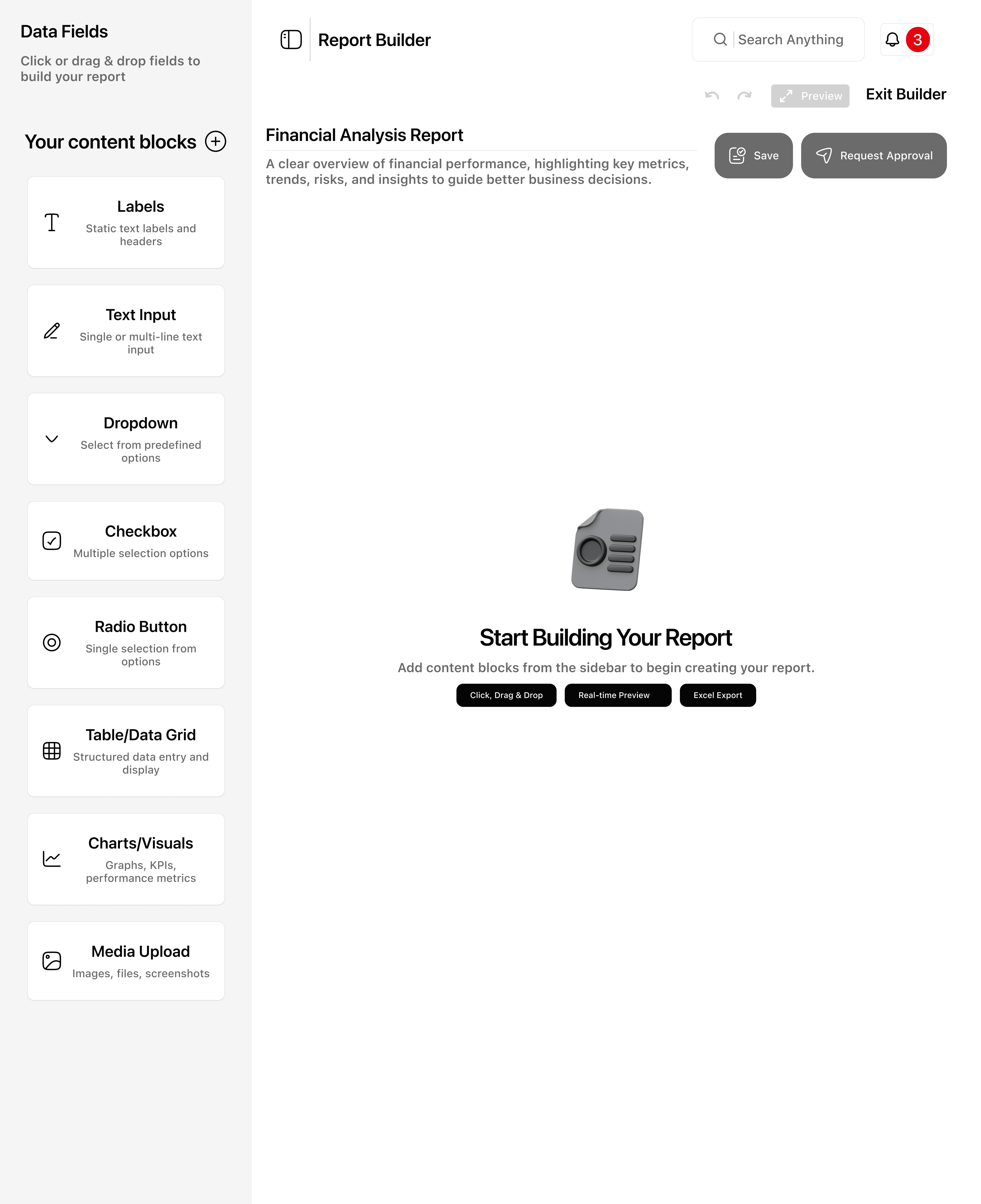 For everyday cooperate users, this fragmentation creates confusion, steep learning curves, and resistance to adopting digital reporting tools. The challenge was to design a single, structured platform that made report creation feel effortless, powerful enough to handle data, yet simple enough for non-technical users to understand at a glance.